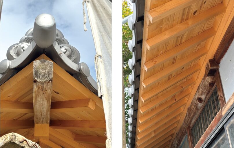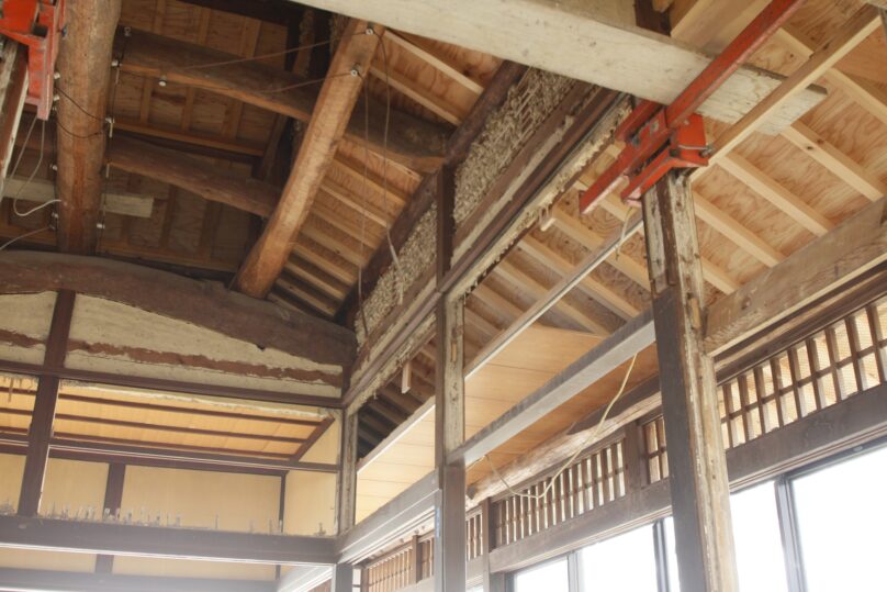 屋根の吹き替えを終え、床や天井を撤去した内部では、太い梁や大黒柱が露わに。150年以上の時を支えてきた構造が、静かにその姿を現していました。参加者は、佐伯さんの案内で、木組みの仕組みや劣化の見極め方、修繕のポイントなど熱心に学びました。