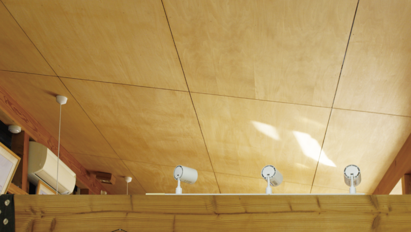 榀(しな)ベニアの天井。黒い下地を入れ、その上からベニア板同士あえて隙間を開けて並べている。そうすることで、細く黒い線で空間が引き締まる