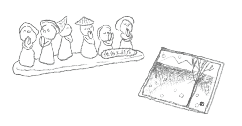 お施主さんからのプレゼントもインテリアのポイント。手づくりのお地蔵さんや消しゴムはんこのポストカードが大切に飾られている