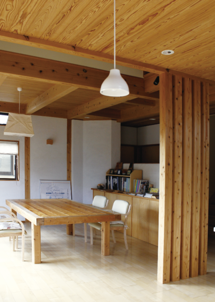 モデルルームは、全て四国の山の木で作られている。テーブルや棚は全て造作。天井は、梁を隠している部分と表している部分を作った
